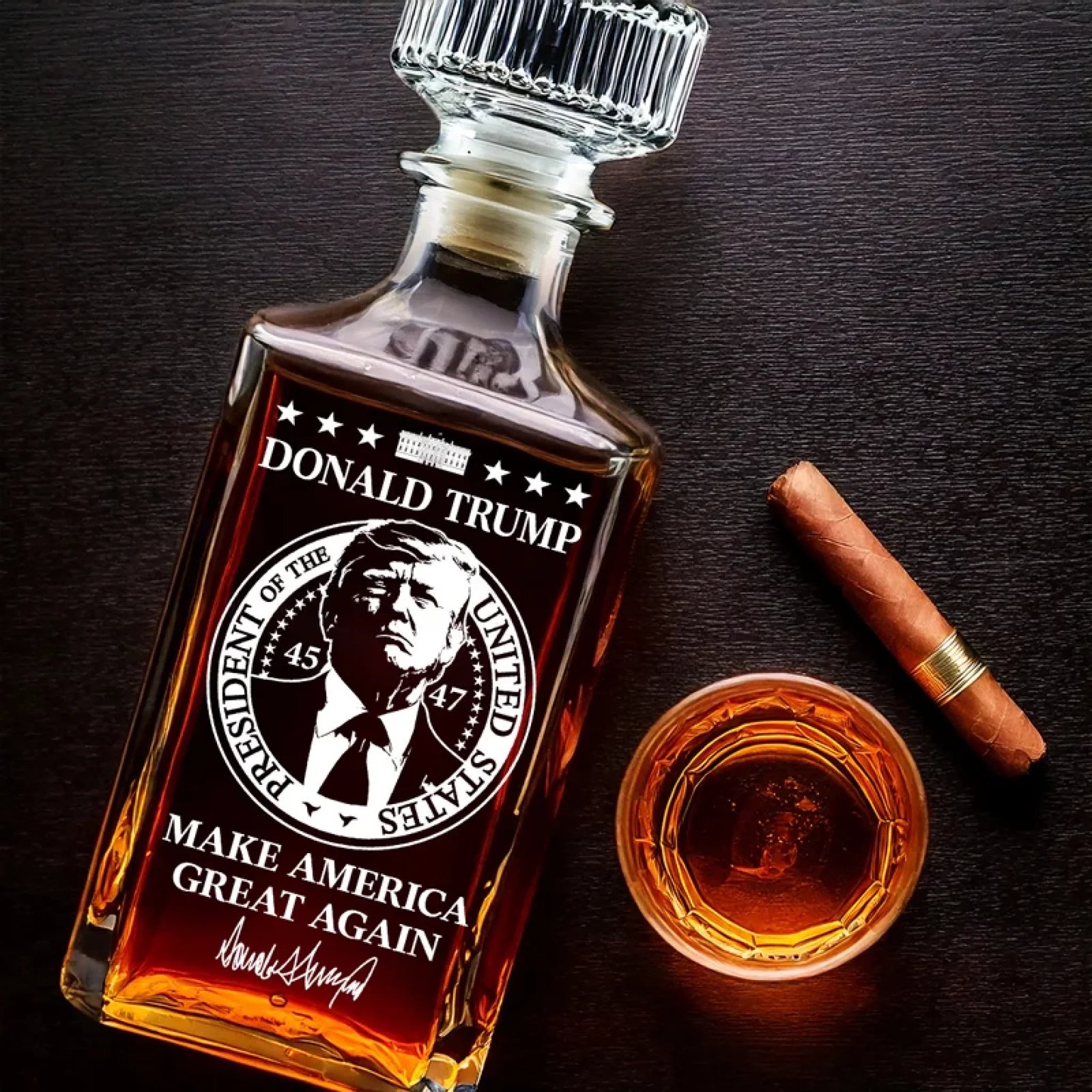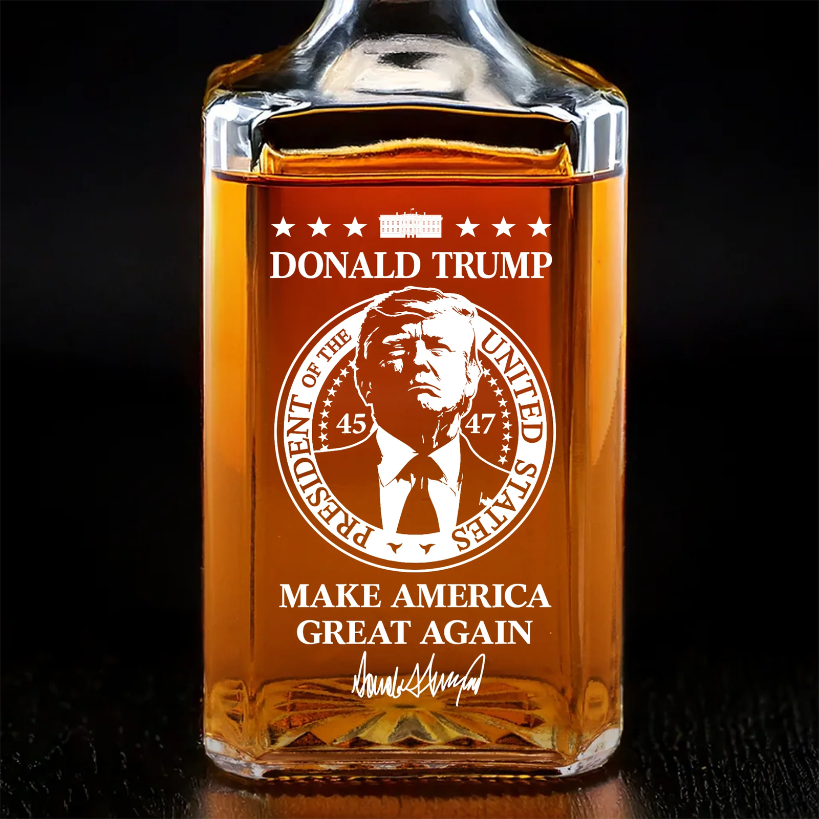 Introducing theUS Patriotic Pride Edition Collection. This whiskey bottle is a statement piece for home bars. and special celebrations. a perfect blend of elegance and practicality. This is the perfect gift for anyone who is Republican or the 47th President supporters.