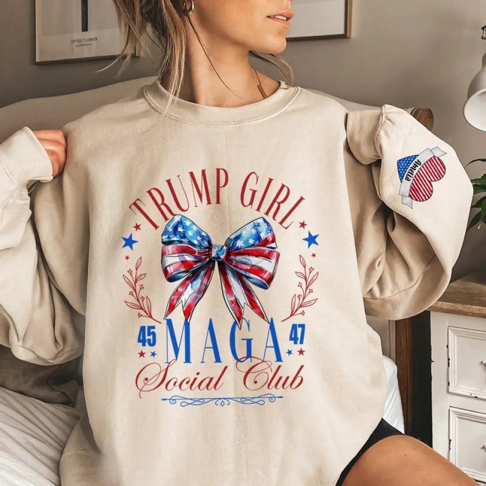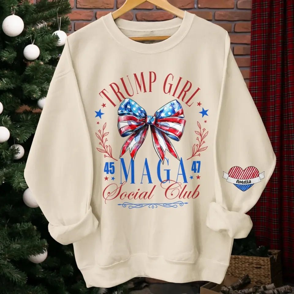 Trump Girl. MAGA Social Club – Trump US Elections Personalized Custom Unisex Sweatshirt With Design On Sleeve – Gift For Best Friends. BFF. Sisters